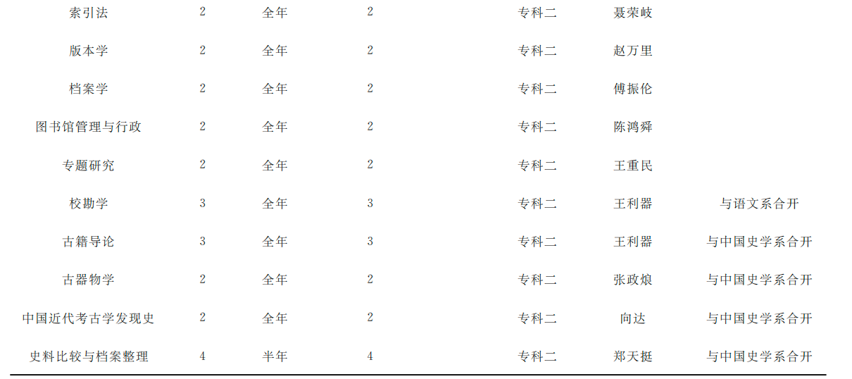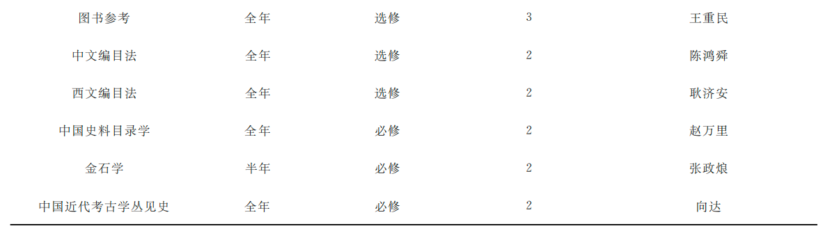 表4中共有12门课,其中全年开设的课程9门,选修课9门,必修课3门,即“中国史料目录学”“金石学”和“中国近代考古学丛见史”开在文学院史学系下。所有任课老师皆为兼职。
