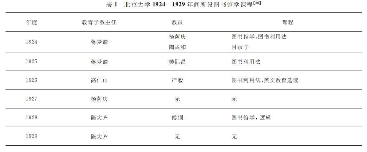 1924年11月18日,北大教务会议通告教育学系内设立图书学科目,并将开设科目及选修办法在全校公布,课程包括:“图书利用法”“图书馆学”“目录学”和“图书馆史”,每周均为两个学时,全部由袁同礼讲授。除“图书馆史”外,其他三科均拟定了课本和选读书目,如“图书利用法”要在艾萨多尔·吉尔伯特·马奇(Isadore Gilbert Mudge)的New Guide to Reference Books Chicago和露西·埃拉·费伊(Lucy Ella Fay)的Instruction in the Use of Books and Libraries Boston两种书中至少选读一种。11月27日,北大教育学系教授会又进一步对图书学各科目的性质和学分进行了重新明确:“图书利用法”“图书馆学”和“目录学”三科学分均为“二单位(学分)”,其中教育系学生,“图书利用法”为必修课,“图书馆学”和“目录学”为选修课,其他各系学生,上述三科均为选修,但不算“单位”,“惟既选修者必须考试,考试及格者与以证明”。1924-1929年北大教育学系开设图书学科目任课教师及所设课程如表1所示。