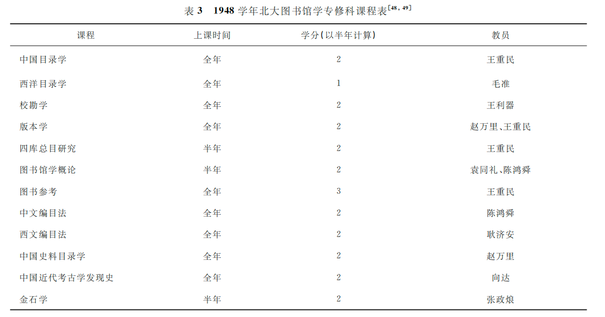 1948年,图书馆学专修科附设于北大文学院语文系内,表3中的课程作为语文系的选修科被列在语文系的课程表中。从表3中可以看出,文献学与考古、历史类课程占了三分之二,文献学的课程最多,有王重民的“中国目录学”和“四库总目研究”、毛准的“西洋目录学”、王利器的“校勘学”,还有赵万里、王重民合开的“版本学”,其课程内容皆偏重文献学。史学系开设的课程,如赵万里的“中国史料目录学”、向达的“中国近代考古学发见史”、张政烺的“金石学”等,在内容上则偏重考古和历史。相比较而言,图书馆学理论和业务课程则相对较少,理论课仅有袁同礼、陈鸿舜合开的“图书馆学概论”,图书馆学业务课程也才只有王重民的“图书参考”、陈鸿舜的“中文编目法”和耿济安的“西文编目法”三门课程,课程体系比较单薄,业务类课程开设了“编目”与“参考”两种,没有开设“图书分类”“图书选购”等,课程体系明显重文献、史学。之所以如此设计,虽然与北大办学理念和王重民办学初衷等主观原因不无关系,但师资力量缺乏、延请不到图书馆学专业教师而无法开课,则是重要的客观因素。