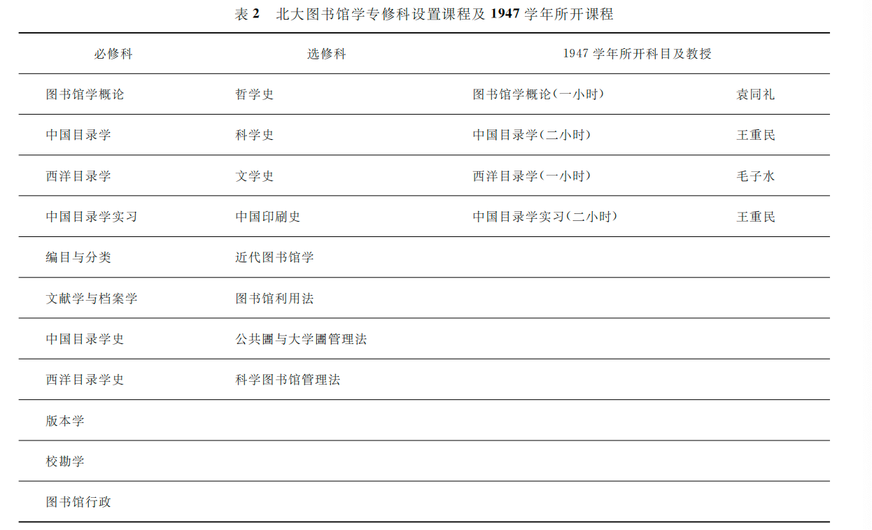 1947年10月,《国立北京大学图书馆及博物馆专科规程》公布,设立图书馆学和博物馆学两种专科,定于本年度秋季招生,暂时附设于文学院内,拟在两年内独立建系,但因经费、人员等问题,实际处于试办时期,并未正式招生。图书馆学专修科所设课程及本学年所开科目如表2所示。