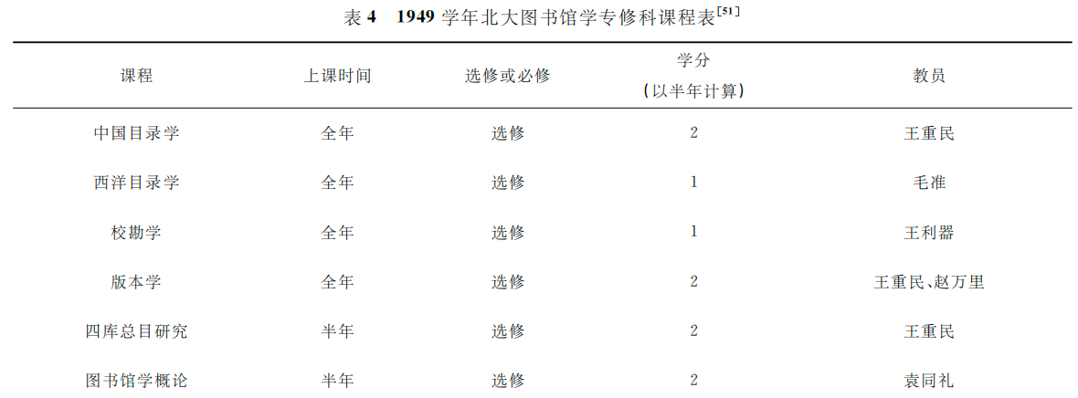 经王重民等诸位先生的积极努力和争取,1949年7月,华北高等教育委员会批准北大图书馆学专修科独立建制并正式成立,王重民担任系主任,计划开设的课程如表4所示。